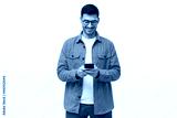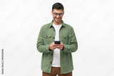 Young man in green casual shirt looking at phone, standing isolated on gray background