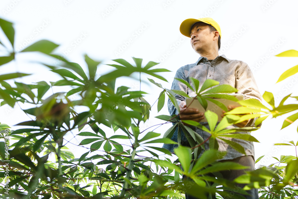 Smart farmer uses a tablet to monitor and analyze the crops in his farm during a sunny day.
