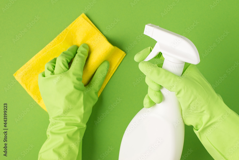 Top view photo of hands in green rubber gloves holding spray detergent bottle and using yellow viscose rag on isolated green background with copyspace