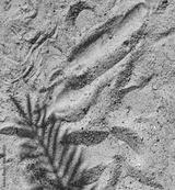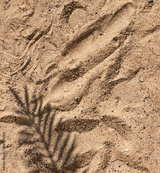 Sand on the beach concept frame with tropical leaf shadow. Summer top view. Copy space