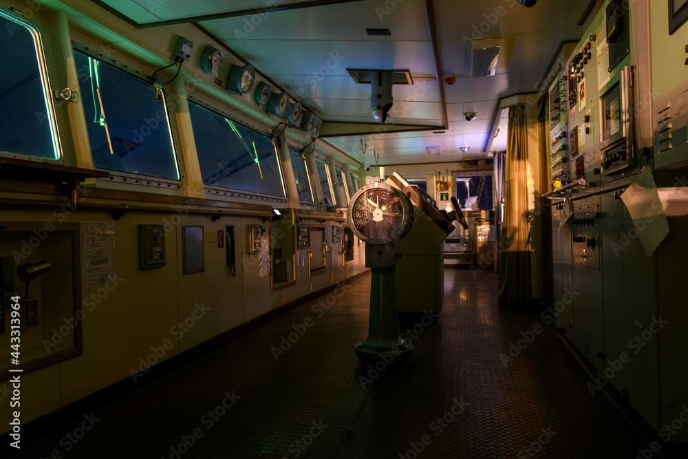 Navigational bridge on big cargo ship. Wheelhouse on vessel at night time.