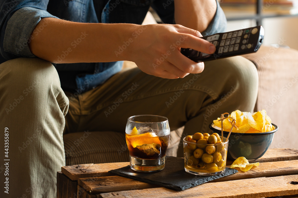 Man drinking vermouth and eating snacks after work at home