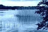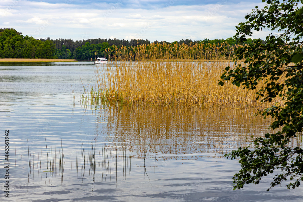 Reeds and wooded shores of Netta river mouth to Necko lake in Masuria lake district resort town of Augustow in Podlaskie voivodship of Poland