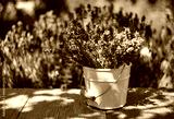 White vase with lavender bouquet on wooden table, on lavender field background