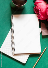 Notepad with a pen and a bouquet of peony flowers on the dark green background concept frame. Top view. Copy space