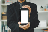 Businessman holding a blank white touch screen smartphone. Used to put text or information to advertise news or sell products online. concept marketing business