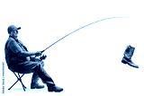 Mature fisherman sitting on a chair with a fishing rod and an old boot on the hook