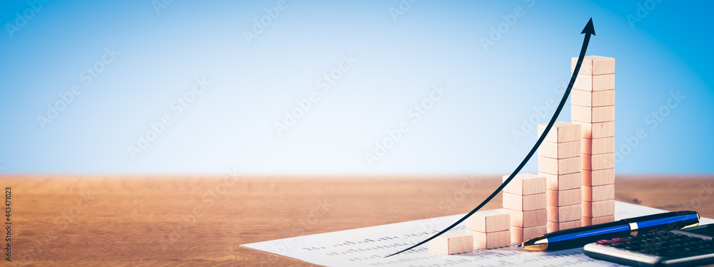 Wooden Statistics Chart On Desk Showing Upward Trend With Pen And Calculator - Business Accounting Concept