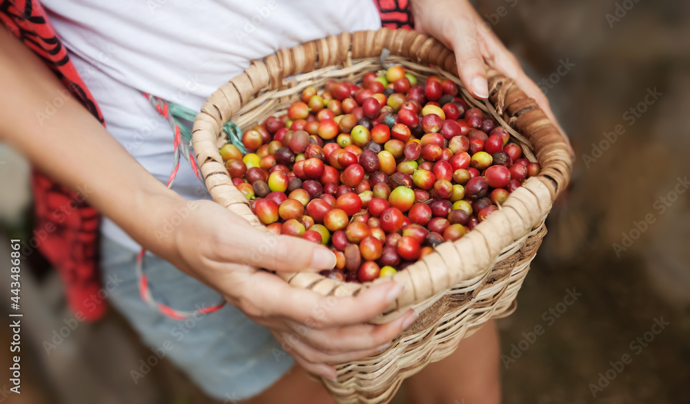 Basket with red ripe coffee beans in a hads of coffee picker at coffee plantation in Colombia. Green tourism and eco plantation. Wicker basket with coffee beans.