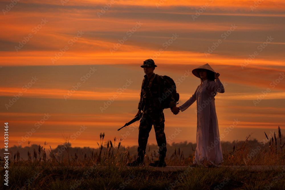 Silhouette soldier hug his girl friend,girl wearing vietnam dresses style