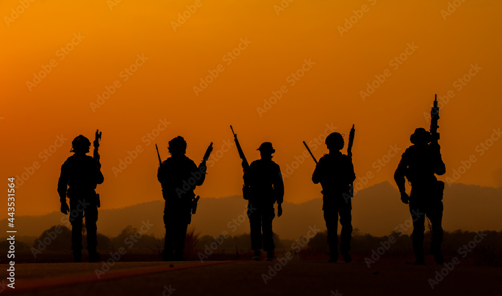 The military silhouettes of soldiers hold gun against with sunset sky background