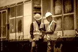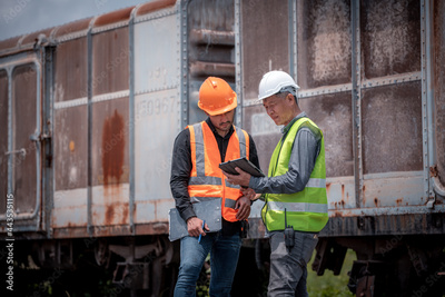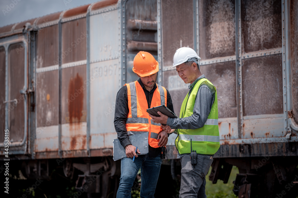 Engineer under discussion inspection and checking construction process railway switch and checking work on railroad station .Engineer wearing safety uniform and safety helmet in work.