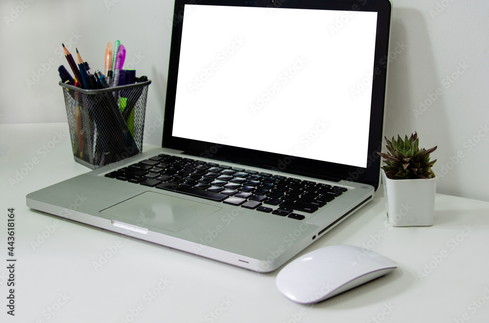 Computer laptop mock up blank white and mouse on desk. Used to put text or information to advertise news or sell products online. concept marketing business