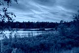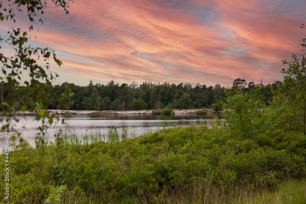 a pond with trees around and sunset sky