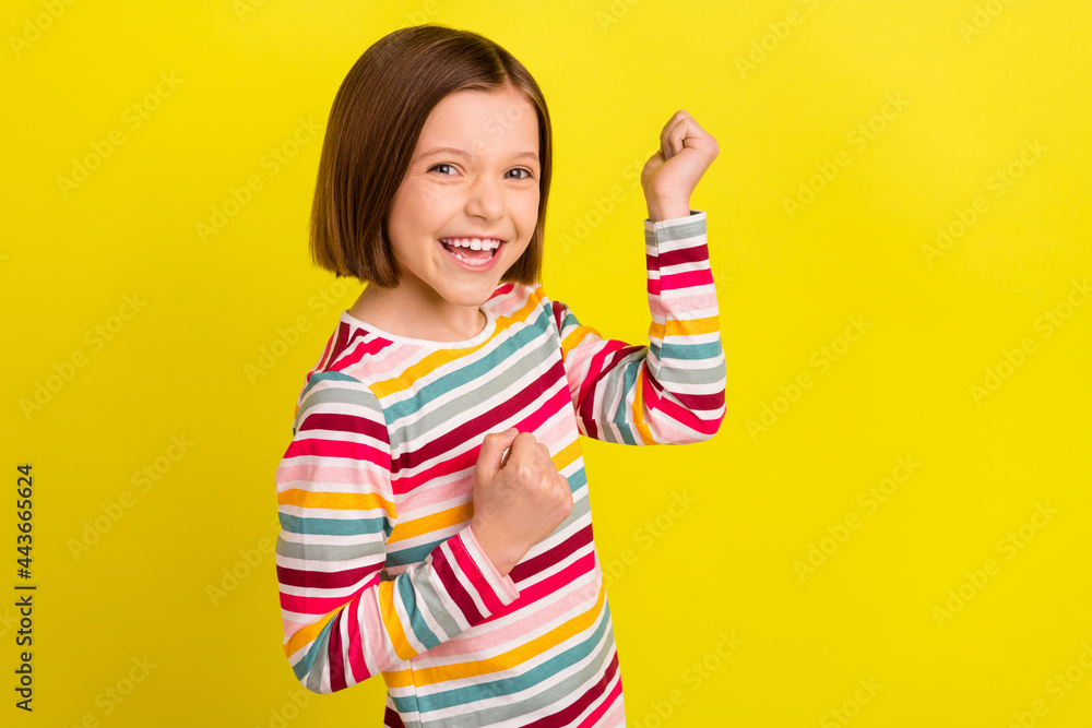 Profile photo of hooray short hairdo little girl hands fists yell wear colorful shirt isolated on vivid yellow color background