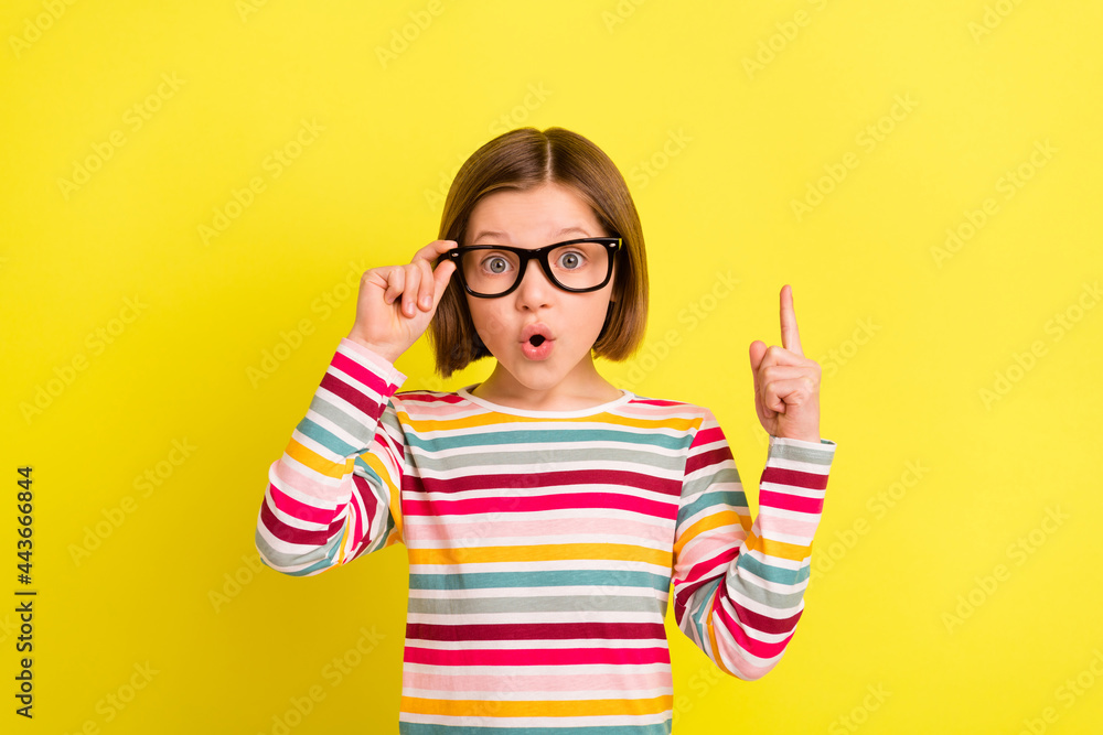 Photo of amazed shocked small girl point finger up idea smart wear glasses isolated on yellow color background