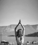 Back view woman practices yoga with hands up pose at nature with beutiful mountains view. Body and mental welness