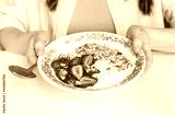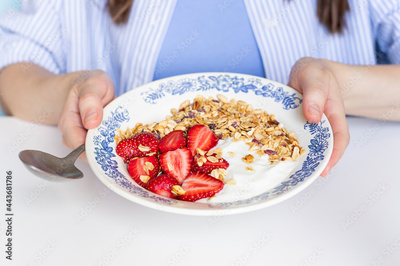 Woman's hands holding homemade granola with fresh organic strawberries and yogurt in the vintage plate. Morning breakfast food concept
