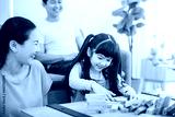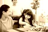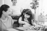 Asian family playing board game with wooden tower together at home.