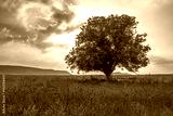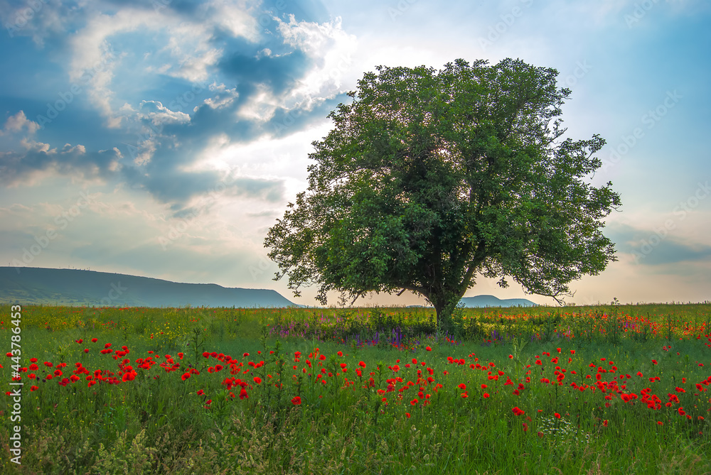 Tree in green, poppy field and dramatic clouds in the sky