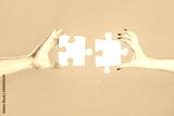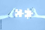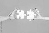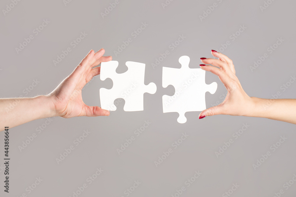 Holding puzzle. Closeup hand of connecting jigsaw puzzle. Business solutions, success and strategy concept. Two hands trying to connect couple puzzle piece on gray background. Teamwork concept