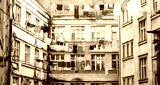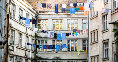 Washed clothes drying. Fresh clean clothes are drying outside. Clothes hanging to dry on a clothes-line. Laundry dryings on the rope. Washed clothes drying outside of an old house
