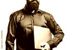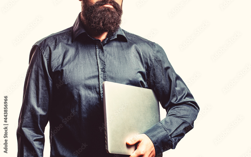 Young businessman using his laptop, pc. Holding laptop computer. Serious handsome bearded man worker laptop