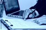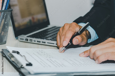 Business Man using computer laptop and pen paperwork document a desk. Business finance, tax, and investment concepts.