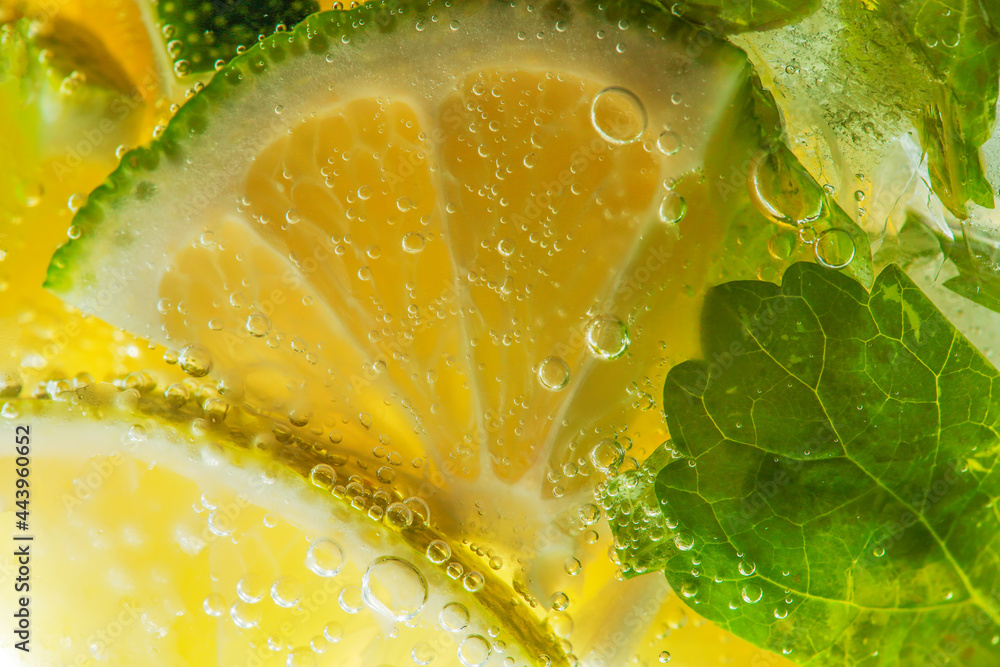 Mojito cocktail macro shot. Lemons, mint leaves, ice cubes and water bubbles