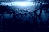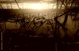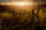 Flood forest and dead tree problems from climate change. Environmental topics background. Concept of save the earth from environmental crisis. Dead trees in flood area with sunset sky. Degraded forest