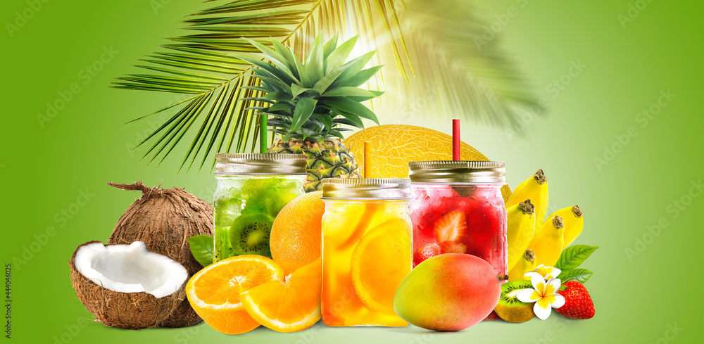 Fresh jars of juice with fruit mix on green background. Concept of tropical summer cocktails, drinks, lemonade