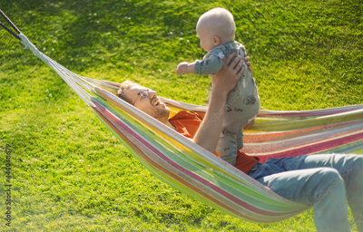 portrait of attractive nerd man with glasses in the park with green lawn have a nice sunset with a baby boy next to the hammock . Happy fatherhood