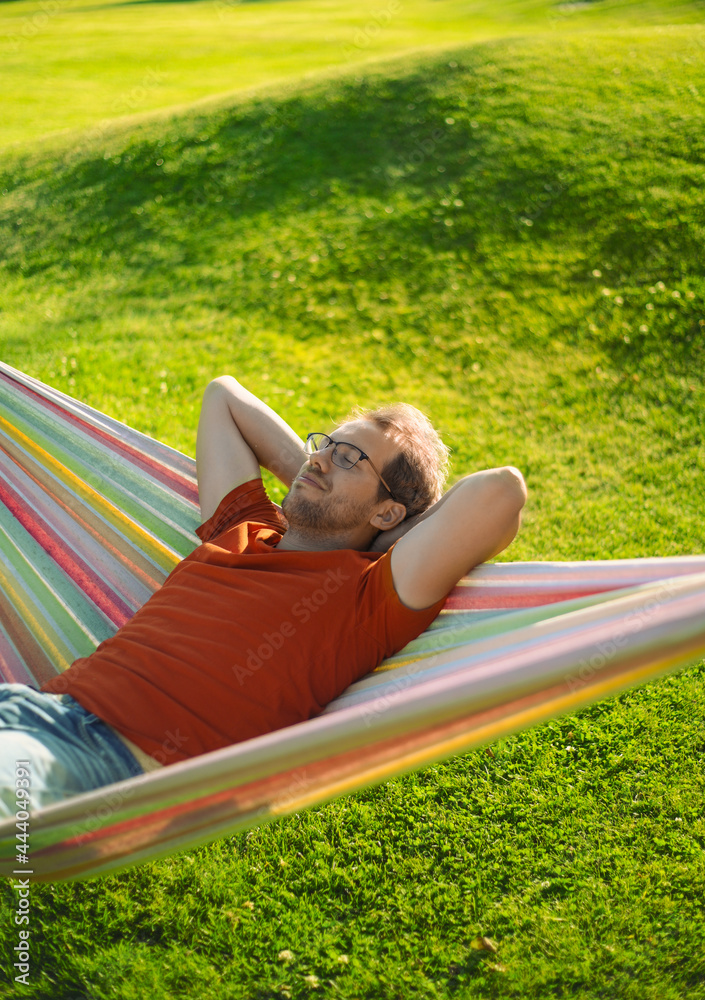 portrait of attractive nerd man with glasses in the park with green lawn have a nice sunset in the hammock . Happy procrastination