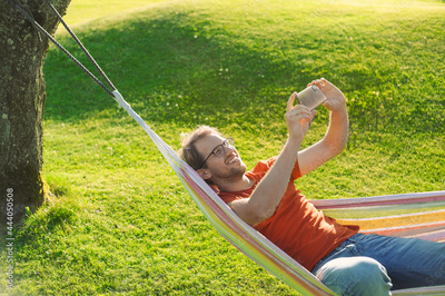 portrait of attractive nerd man with glasses in the park with green lawn have a nice sunset in the hammock . Happy procrastination with phone