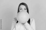Photo portrait girl inflating purple air balloon preparing to party isolated pastel pink color background