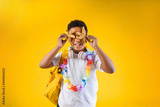 Happy boy holding sea stars wearing hawaiian lei flower necklace with backpack on yellow background