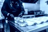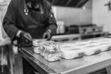 Food in disposable dishes ready for delivery. The chef prepares food in the restaurant and packs it in disposable lunch boxes.