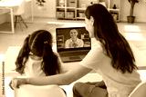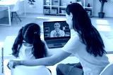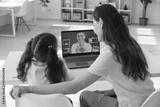 Back view happy school child together with mom sitting at desk table, looking at laptop, learning letters in online class, watching teacher's educational kids video in covid19 corona virus quarantine