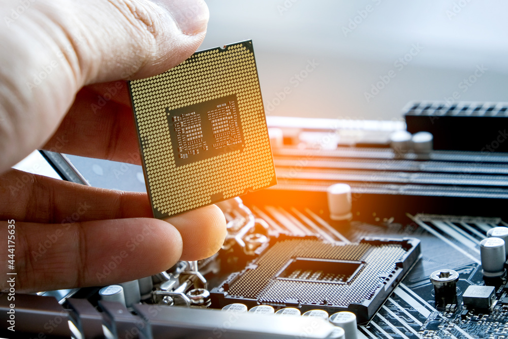 Hand of computer engineering brings computer cpu processor memory change components into socket processor for maintenance.Technology and development concept