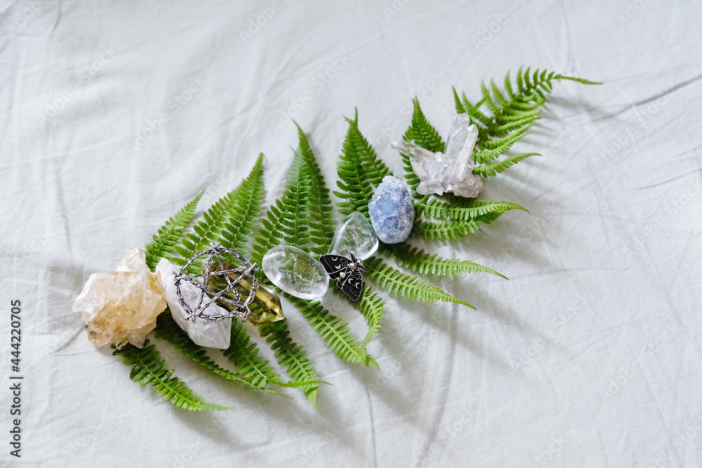 healing gemstones crystals, wiccan amulets, fern leaf on fabric background. Witchcraft Esoteric pagan Ritual. aura cleansing, modern wicca concept. top view