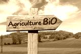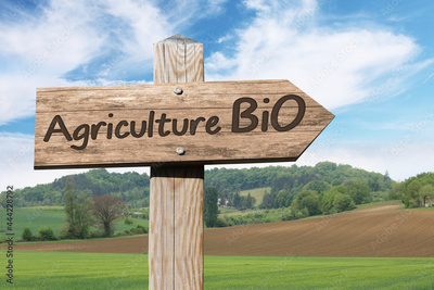 Agriculture Bio, panneau en bois dans paysage nature et campagne