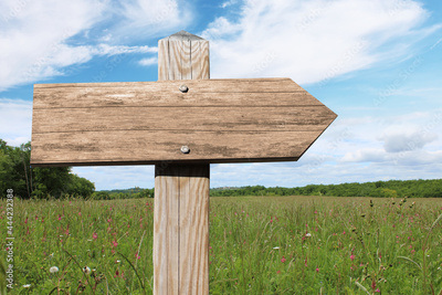 Panneau en bois dans paysage nature et campagne, avec espace vide pour du texte, mockup