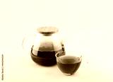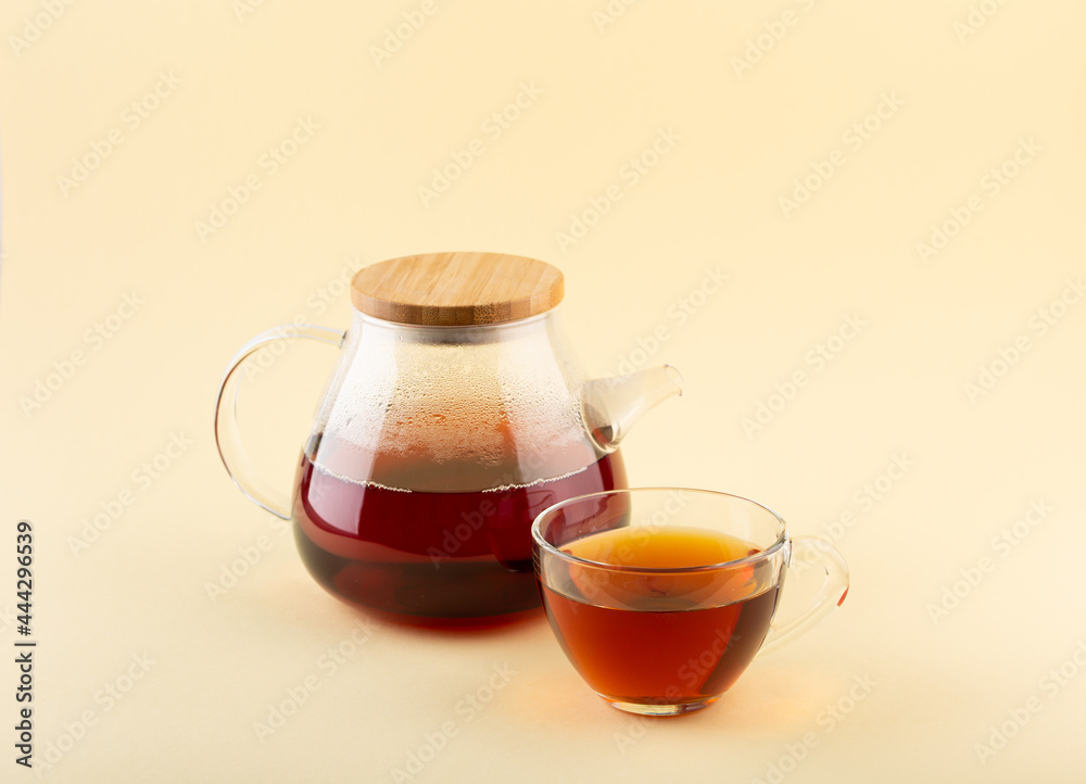 Glass transparent teapot and cup with black tea