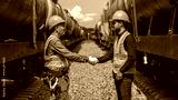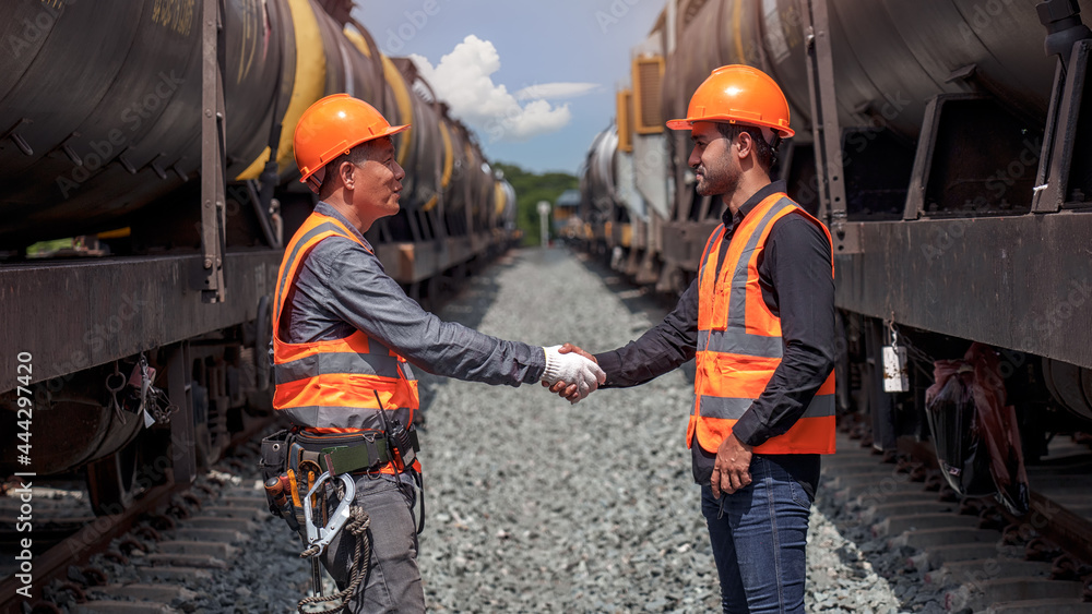 Engineers check hand, senior engineer and junior engineer check hand on freight train background