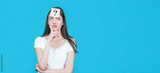 Thinking woman with question mark. Doubtful girl asking questions to himself. Paper notes with question marks. Confused female thinking with question mark on sticky note on forehead