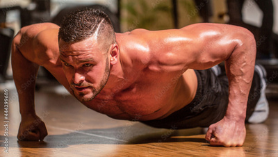 Muscular and strong guy exercising. Slim man doing some push ups a the gym. Man doing push-ups. Muscular man doing push-ups on one hand against gym background. Sport