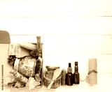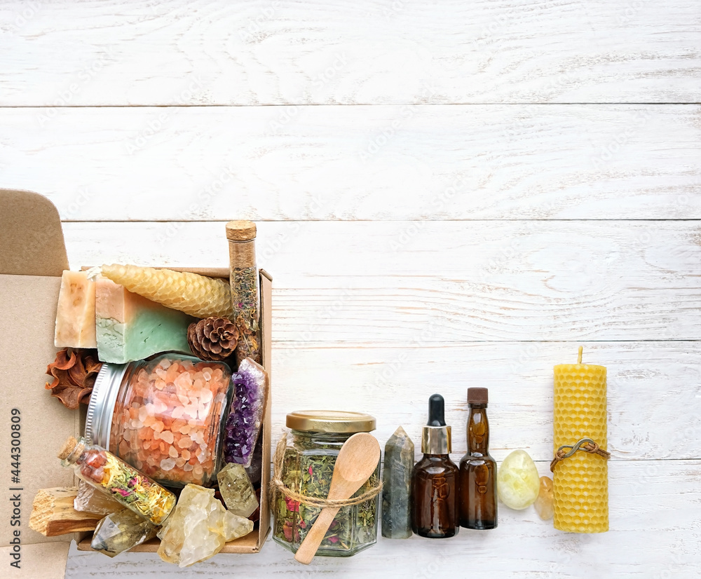 gift box with self care body items, zero waste cosmetics products. Candle, sea salt, soap, healthy herbal, gemstones. eco friendly self care package for family, friends. flat lay. copy space