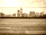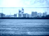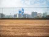 Tabletop wooden counter Rooftop bar Blur cityscape background