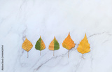 autumn birch leaves on marble background. Autumn composition. Minimal concept. Copy space. flat lay