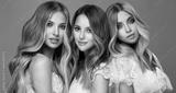 Three beautiful girls in white wedding dresses with hair coloring in ultra blond. Stylish hairstyle curls done in a beauty salon. Fashion, cosmetics and makeup.Adorable brides